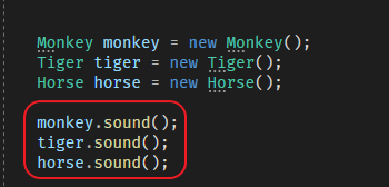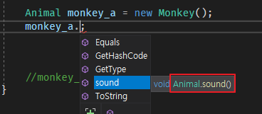 실제로 Animal타입으로 만든 변수로 지정을 할경우 sound 메서드를 찍어보면 Animal.sound()라는걸 알 수 있습니다.