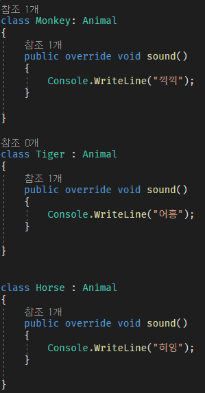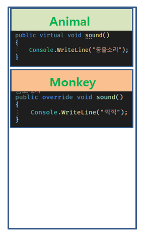 Monkey 클래스는 Animal 클래스를 상속받은 형태이고 , 두 클래스의 메소드는 같은 이름과 같은 시그니쳐로 구성 되어 있습니다.