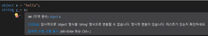 반면에 object(상위객체)을 string(하위객체)로 암시적 변경을하려고하면 아래와 같은 에러가 발생합니다.