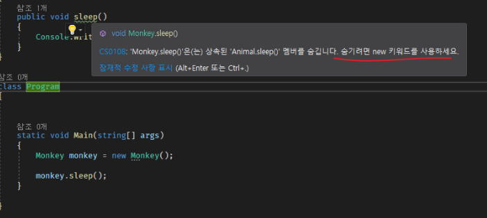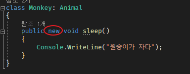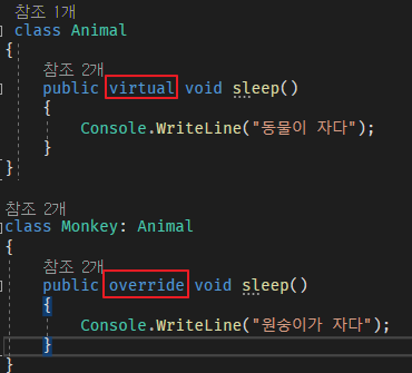 new를 사용할때는 자식 클래스의 메소드에만 표시를 해주었다면, 이번에는 부모 클래스, 자식 클래스 모두에게 명시적으로 표현해주는 방법입니다.