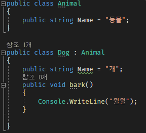현재 구성된 코드는 Animal이라는 부모 클래스와 Dog라는 자식(파생)클래스가 준비되어 있습니다.
