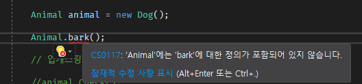 (업캐스팅이 된 이후 기존 Dog에서 가지고 있던 bark를 쓸수 없는 상황)