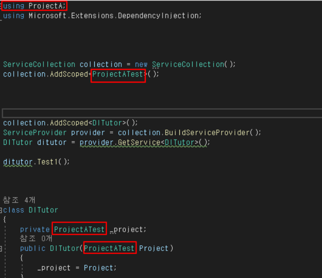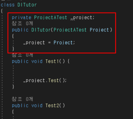 만약 이전처럼 ProjectBTest의 메소드를 사용하고 싶으면 아래 빨간색 사각형 부분만 수정하면 되니 이전보다 의존성이 낮아졌다고 볼 수있는거죠.