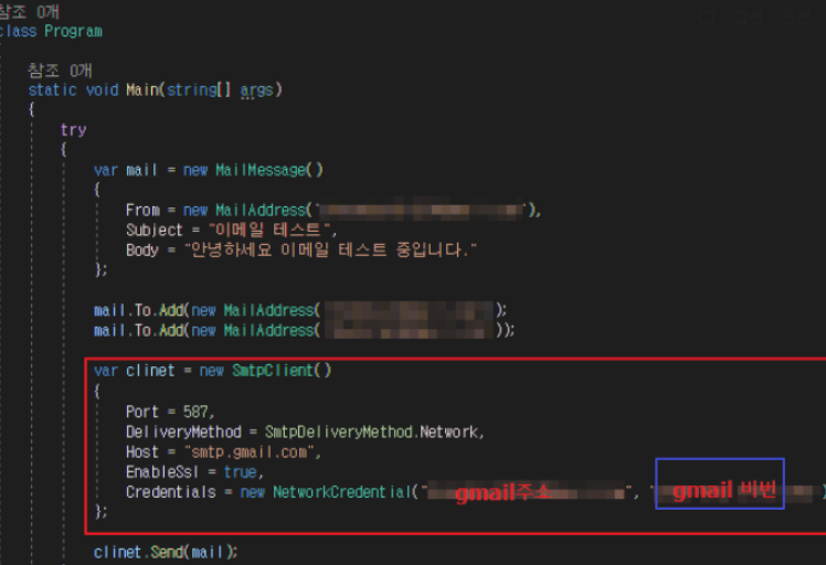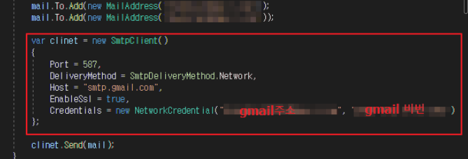 기존에는 NetworkCredential 클래스 첫번째 인자로 gmail주소, 두번째 인자에 gmail비번을 넣어주었습니다.