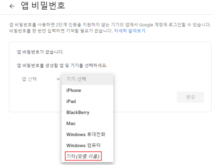 앱비밀번호를 생성할 기기는 기타(맞춤 이름)으로 선택합니다.