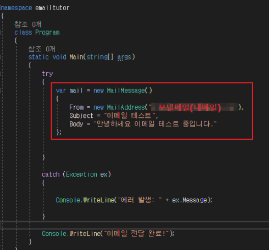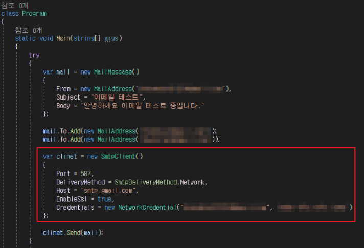 SmtpClient객체를 만들고 그 안에 각각의 정보를 넣어줍니다.