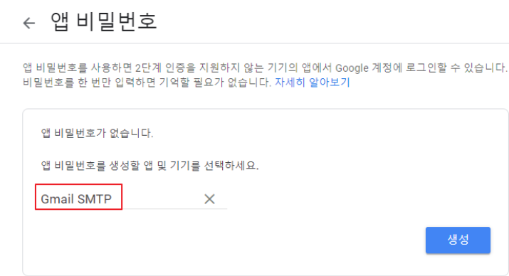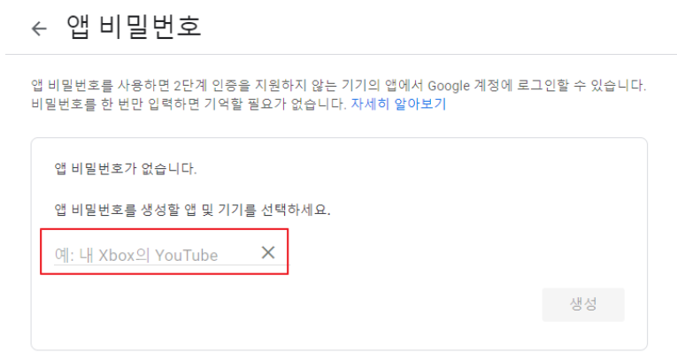 2단계 인증이 완료되면 앱 비밀번호를 설정이 가능해집니다.