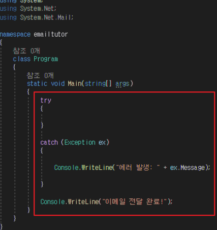 (2) 이메일 전달 중에 발생할 수 있는 에러를 확인하기 위해 try , catch 문을 추가합니다.