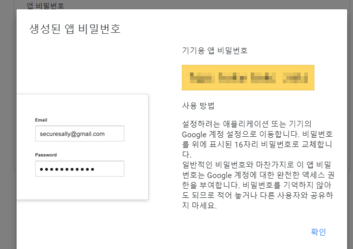 노란 색 사각형 부분에 적힌 값이 우리가 필요로하는 앱 비밀번호입니다.