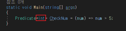 아래 예시는 int형태의 매개변수를 받고 최종 리턴값이 Boolean인 값을 Predicate 델리게이트에 담은 것입니다.