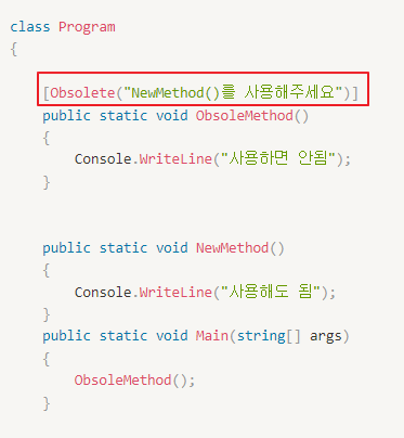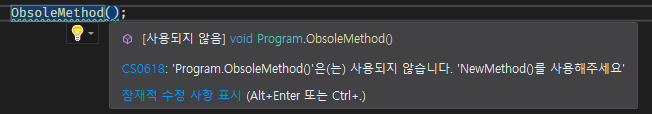 우선 어트리뷰트의 예시로 c#의 빌트인(내장) 어트리뷰트 중 하나인 Obsolete를 소개하겠습니다.