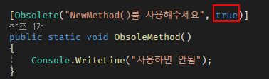 방법은 간단합니다. Obsolete 어트리뷰트의 두번째 인자에 true값을 넣어주면 됩니다.