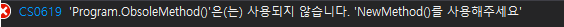 실제로 Obsolete 어트리뷰트를 붙힌 해당 메소드를 그대로 실행해버리면 아래와 같은 경고 문자가 뜨고 실행은 정상적으로 됩니다.