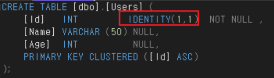 MSserver 에서는 AutoIncrement 기능을 IDENTITY(1,1)로 표현합니다.