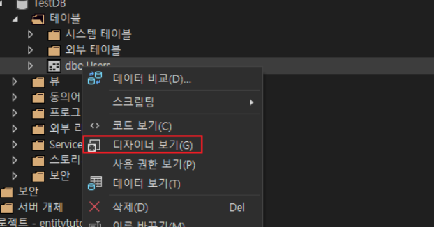 먼저 테이블 마우스 오른쪽 클릭 후 디자이너 보기를 클릭합니다.