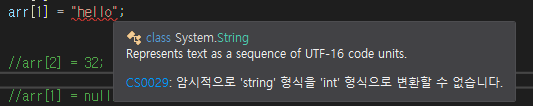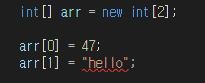 왜냐하면 우리가 기존 배열 생성시, int타입의 값만 받겠다고 설정했는데, 다른 타입이 들어오려고 하니 발생하는 에러입니다.