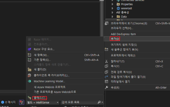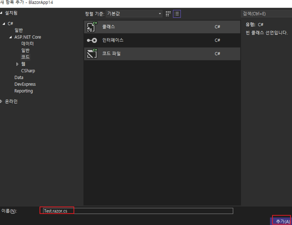 추가버튼을 누르면 자동적으로 razor파일 밑에 .cs파일이 생성되는 것을 알 수 있습니다.