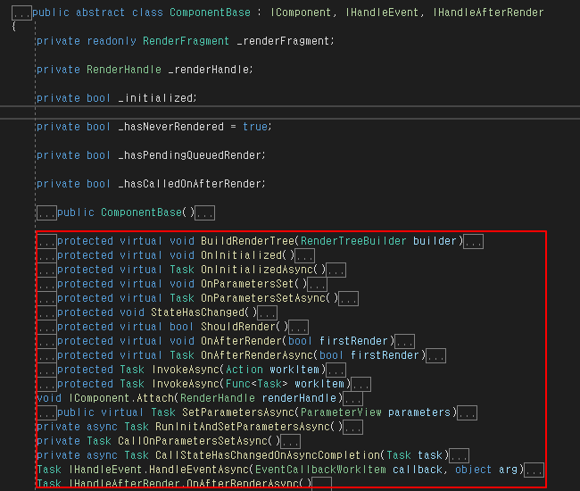 ComponentBase정의에 접속해 보면, 코드 스페이스에 주로 사용되는 여러 메소드들이 정의 되어있는걸 알 수 있습니다.