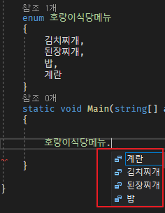 마찬가지로 .(점)을 찍으면 해당 enum객체의 내용물이 보이게 되죠.