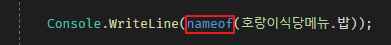 이 외에도 해당 요소를 문자형으로 보고 싶으면 nameof()를 사용하면 됩니다.