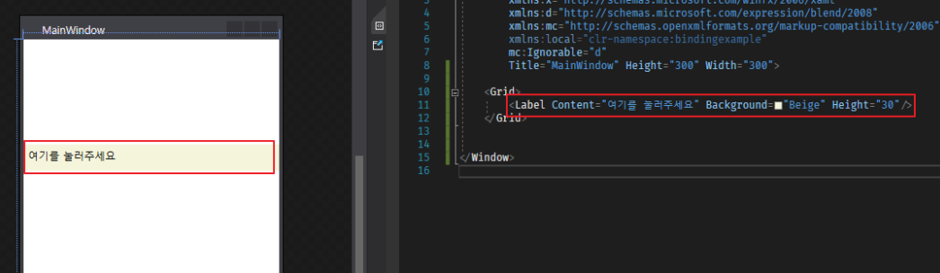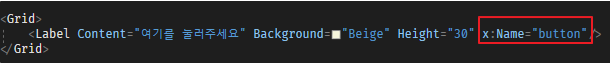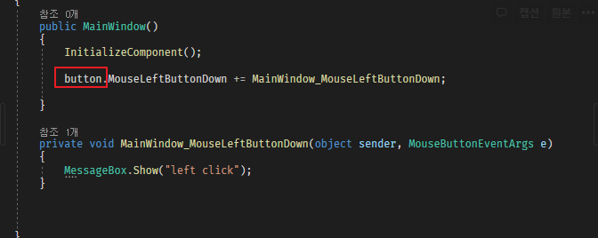 앞서 전체를 기준으로 했을때와 차이가 있다면, xaml에서 Name명으로 지정했던 "button"을 이벤트 앞에 적어주었다는 점입니다.