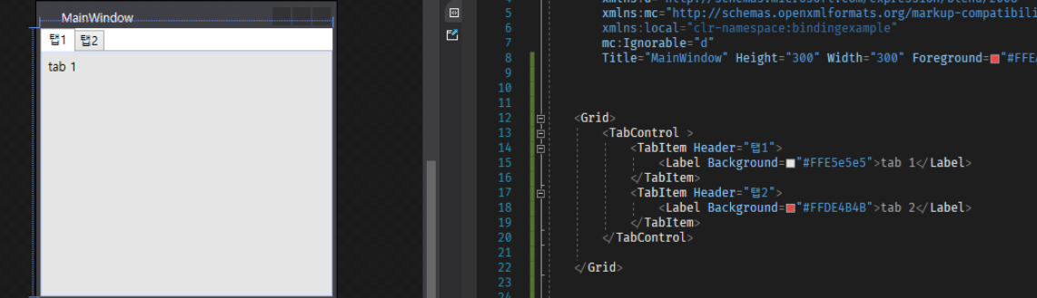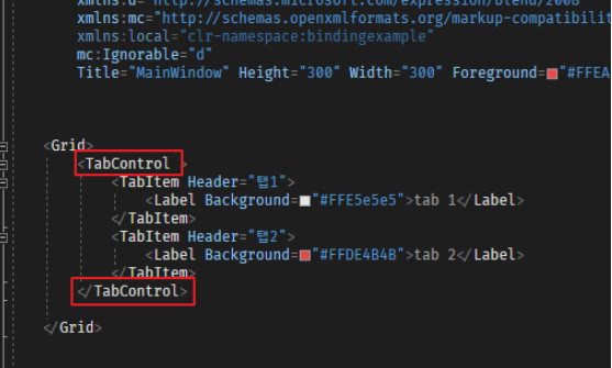 탭은 특이하게 TabControl이라는 메인 엘리먼트를 기준으로 그 안에 자식 엘리먼트인 TabItem을 둡니다.
