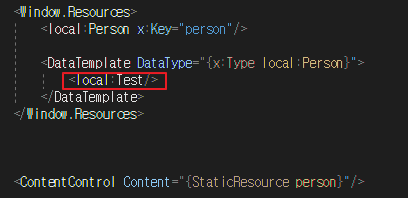 DataType = {x:Type local:Person}가 의미하는것은 누군가 Person클래스를 출력하려고하면 '파란색 사각형안에 작성한 형태대로 출력하라'는 의미입니다.
