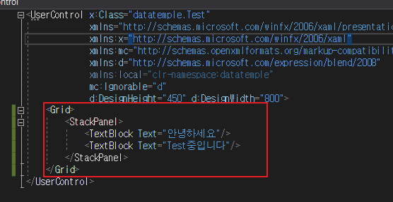 MainWindow.xaml로 돌아가서 빨간 사각형부분에 Text.xaml을 의미하는 <local:Test/>를 적어주면 Text.xaml이 출력됩니다.