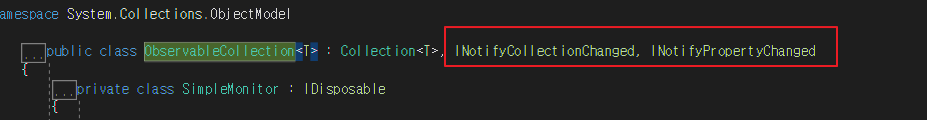 ObservableCollection 원코드에 접속해보면 빨간색 네모박스에 Notify~라고 적혀있는 인터페이스가 상속되어있는것이 보이실겁니다.