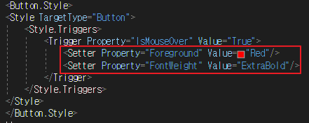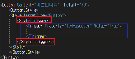 2) 그 안에 <Style.Triggers> 태그를 감싼 후, <Trigger> 태그를 넣어줍니다.