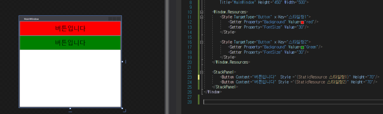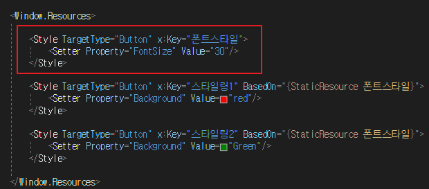 다음으로 상속 받을 곳에 각각 BasedOn 이라는 속성값에 {StaticResource Key명} 형태로 값을 넣어 상속을 받습니다.