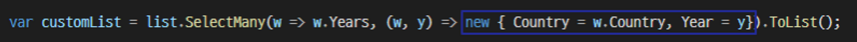 그럼 새롭게 생성된 [ic]new { Country = w.Country, year =y } [/ic] 는 어떤 모습일까?