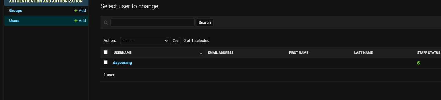 등록을 완료했으면 admin 페이지에 접속을 해보자! 여기 Users를 클릭해보면