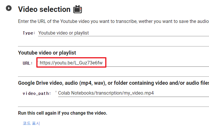 추출하고자 하는 영상 주소를 입력한 뒤 셀을 실행합니다.