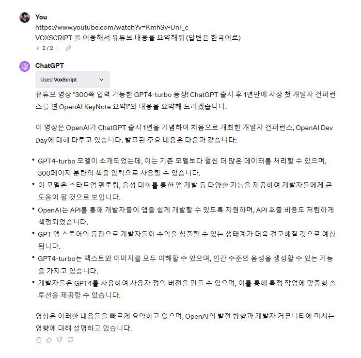 영상 URL과 함께 요약 해달라는 프롬프트를 입력하면 자동으로 VoxScript 플러그인이 동작합니다.