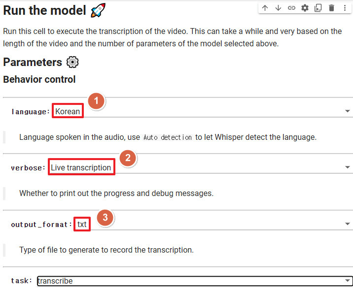 아래 조건에 맞춰 값을 입력한 뒤 셀을 실행합니다.