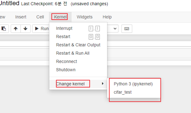 커널창에 jupyter notebook을 입력하여 쥬피터 노트북에 접속합니다.