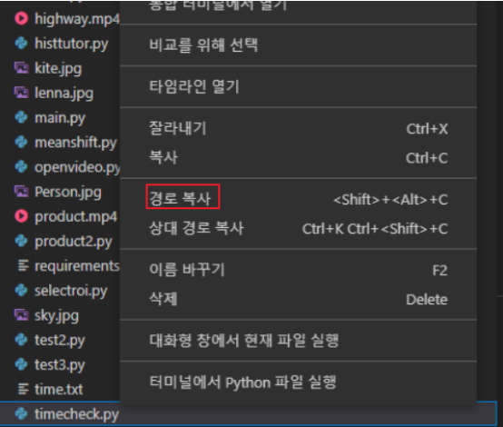 먼저 우리가 실행할 파일을 마우스 오른쪽 클릭하여 경로를 복사하면 절대경로를 가져올 수있습니다.