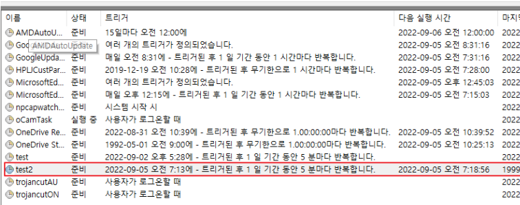 윈도우에서 자동으로 실행 되는 여러 파일 중 우리가 만든 파일(test2)를 발견할 수 있을 겁니다.