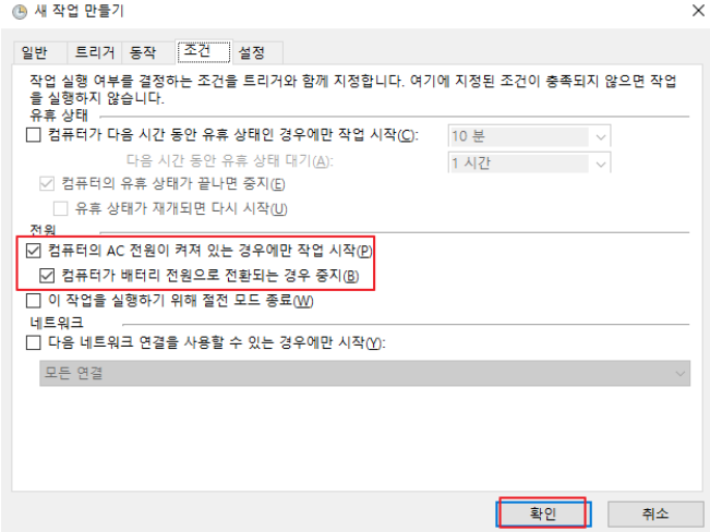 컴퓨터가 실행되어있다면 언제든 실행 될 수있도록 아래 체크를 해제해주고 확인 버튼을 누릅니다.