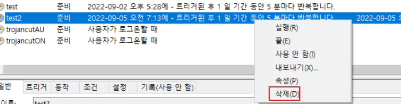 혹시 해당 스케쥴링 파일을 삭제하고 싶다면 마우스 오른쪽 클릭 후 삭제를 누르시면 됩니다.
