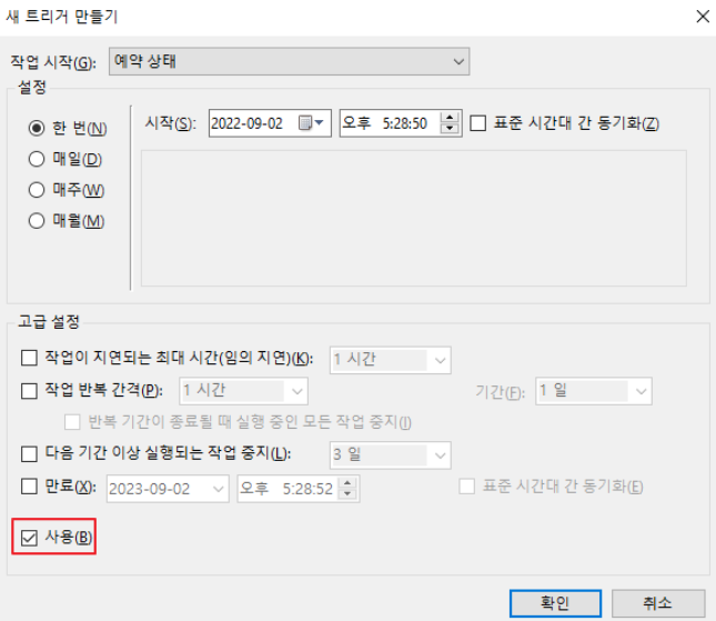 해당 탭은 어느 주기로 프로그램을 실행시킬지를 정해주는 탭이라 보면됩니다.