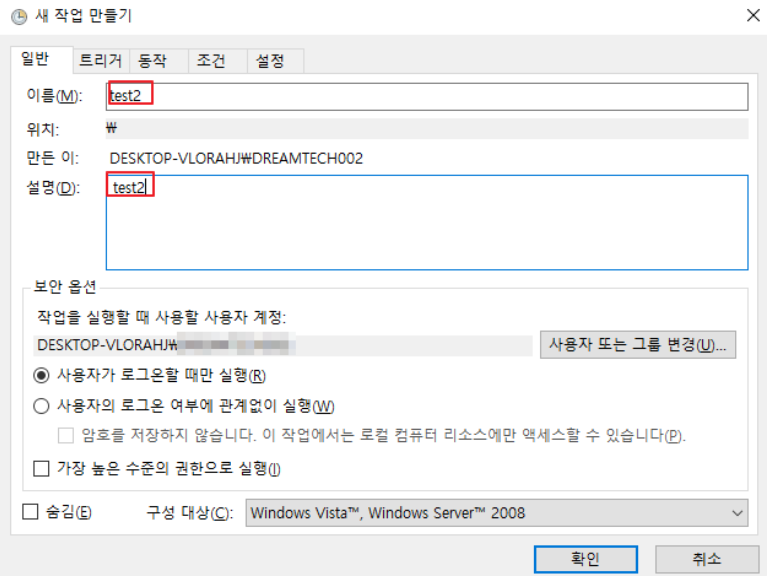 여러분이 알아 볼만한 설명을 이름과, 설명란에 적어주면 됩니다. 저는 그냥 간단하게 test2라고 적어보았습니다.