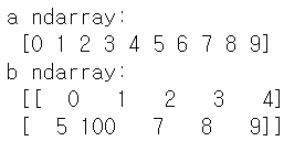 이번에는 b의 2행 2열인 '6'을 '100'으로 변경 해보겠습니다. 과연 어떤 결과가 나올까요?