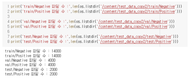 각 디렉토리 파일 개수를 확인해보니 fixed 첫번째 인자로 넣어준 값이 validation, 두번째가 test의 파일 갯수를 의미하고 나머지는 자연스럽게 train으로 할당되었습니다.