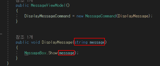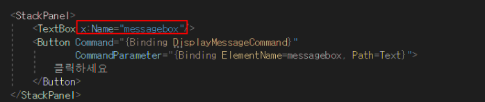 예제코드에서는 바인딩을 통해 TextBox로부터 전달받은 값을 CommandParameter로 전달 하는 구조입니다.