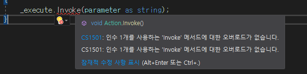 왜냐하면 우리가 앞서 정의한 Action은 인자를 받지 않는 델리게이트 형태이기 때문입니다.